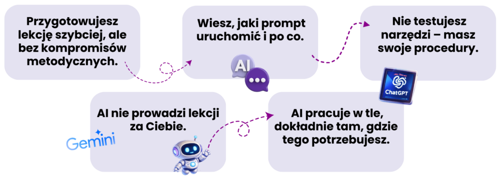 Tak, i to jest jego główny cel. Asystenci, których zbudujesz, pomogą Ci między innymi: planować lekcje tworzyć materiały, handouty i karty pracy przygotowywać zadania i kartkówki dawać feedback uczniom porządkować pracę z uczniami, którzy nie byli na lekcji To kurs, który realnie odciąża głowę, a nie dokłada kolejnych obowiązków.